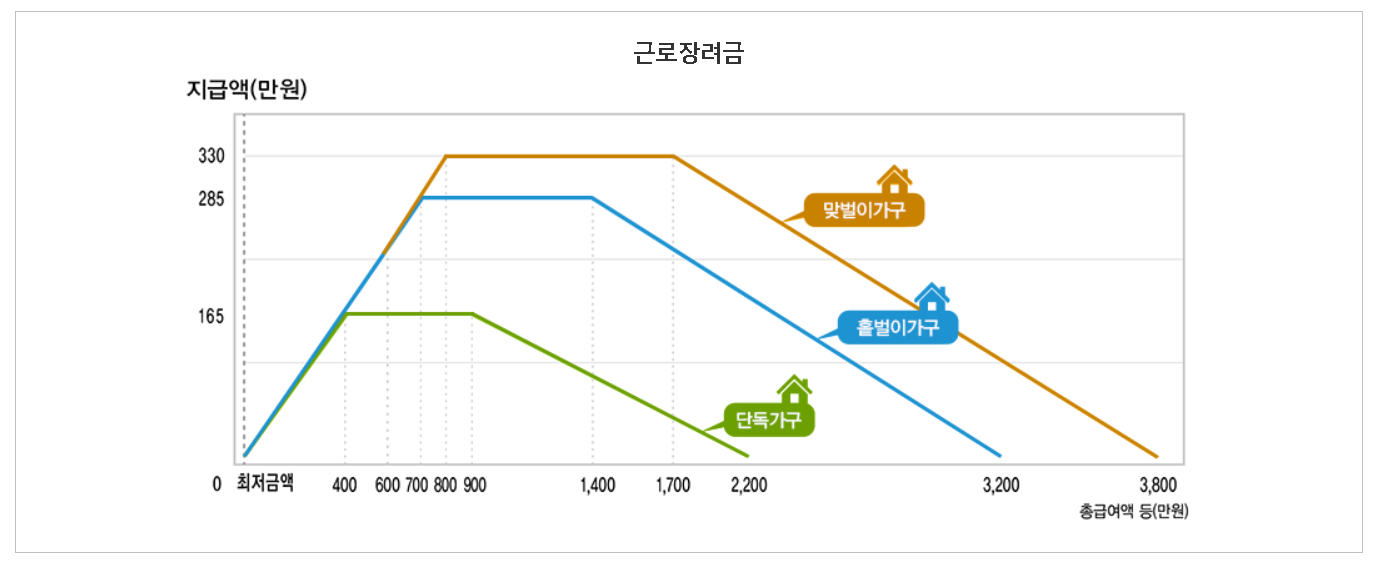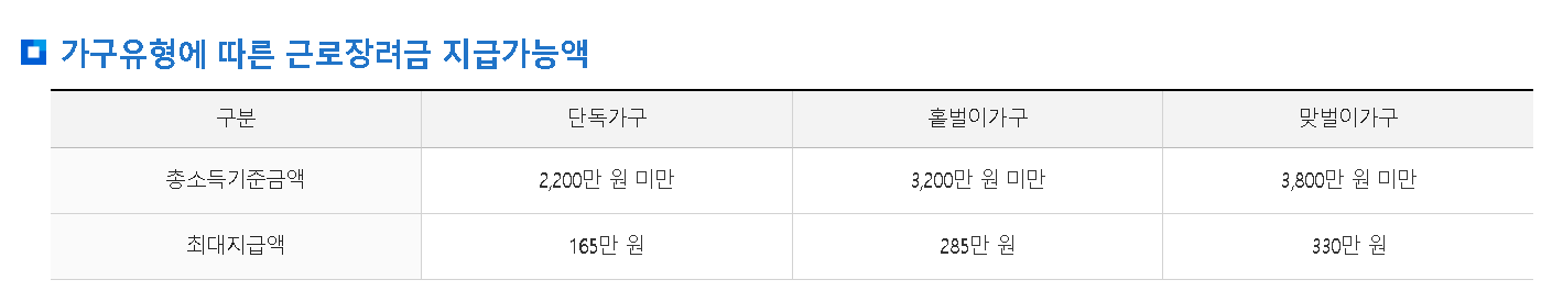 근로장려금 자격과 최대 지급금액은 단독가구 총소득 2,200만원 미만일 경우 165만원 지급, 홑벌이 가구 3,200만원 미만일 경우 285만원 지급, 맞벌이 가구 3,800만원 미만일 경우 33만원을 지급합니다.