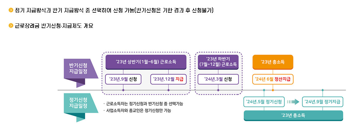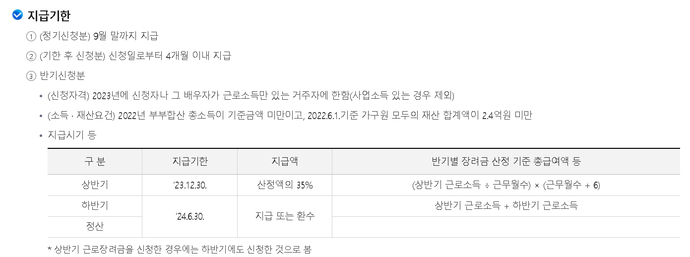 근로소득자 반기신청의 경우 상반기와 하반기를 나누어 놓은 이유는 소득 발생시점과 수급 시점간의 차이 발생을 고려하여 장려금 지원금의 실질적인 체감도를 높이기 위해서라고 생각하시면 되고 소득의 정확성을 파악하기 쉬운 근로소득자만 해당합니다.