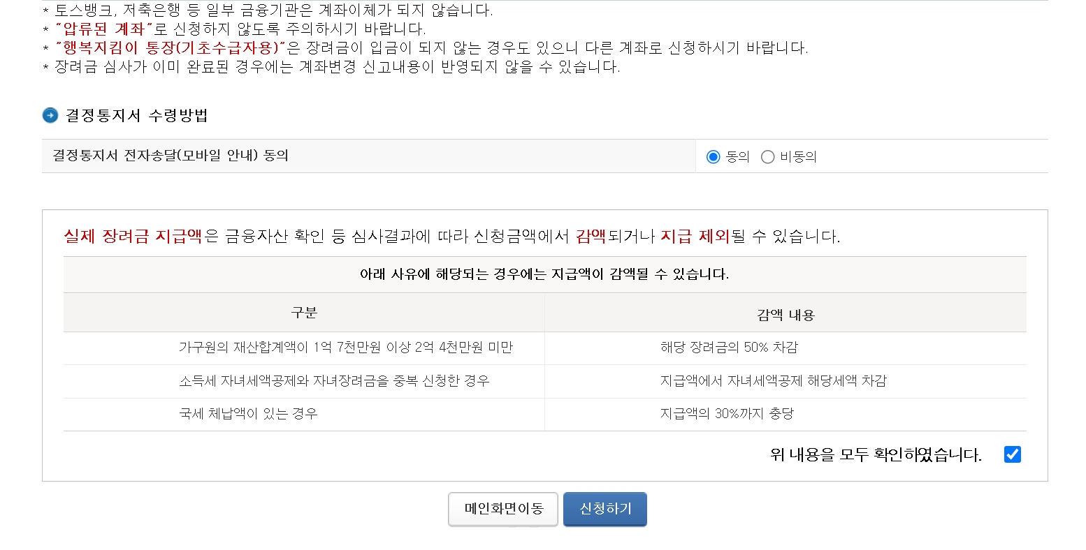 결정통지서 수령방법에 동의를 하고 감액사유를 확인한 다음 신청하기를 클릭합니다.