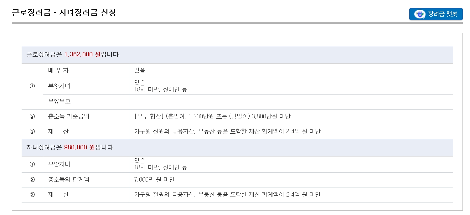 최종 지급될 내용을 확인하면 근로장려금, 자녀장려금 신청은 완료된 것입니다.
