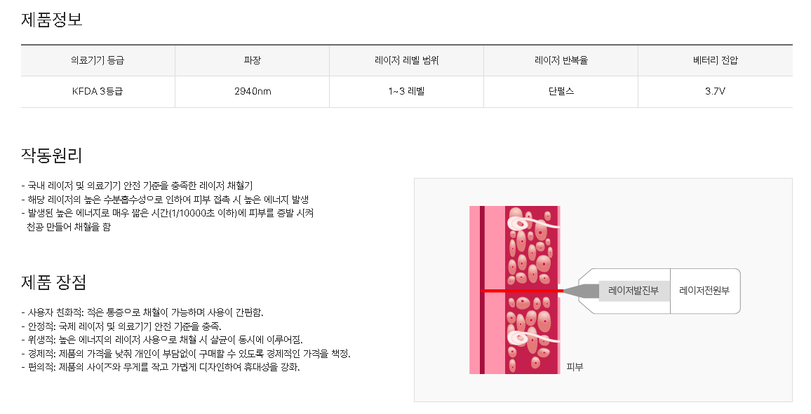 병원 뿐만이 아닌 가정에서도 사용할 수 있도록 진입장벽을 낮추면서 초소형 고출력 레이저 기술을 기반으로 레이저와 피부 미용 의료기기, 레이저 채혈기 관련 사업을 활발히 진행하고 있습니다.