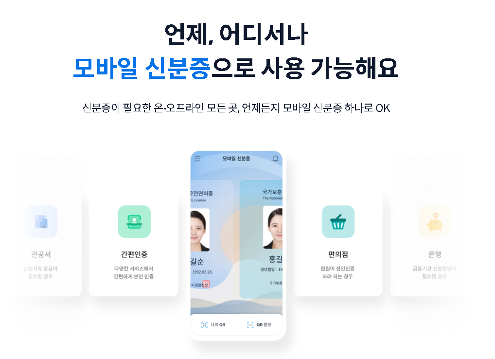 은행에서 편의점까지 온라인과 오프라인 어디서나 편리하게 사용이 가능하며 실물 신분증과 동일한 효력을 가지고 있기 때문에 신분증이 필요한 곳에서는 어디든지 사용이 가능합니다.