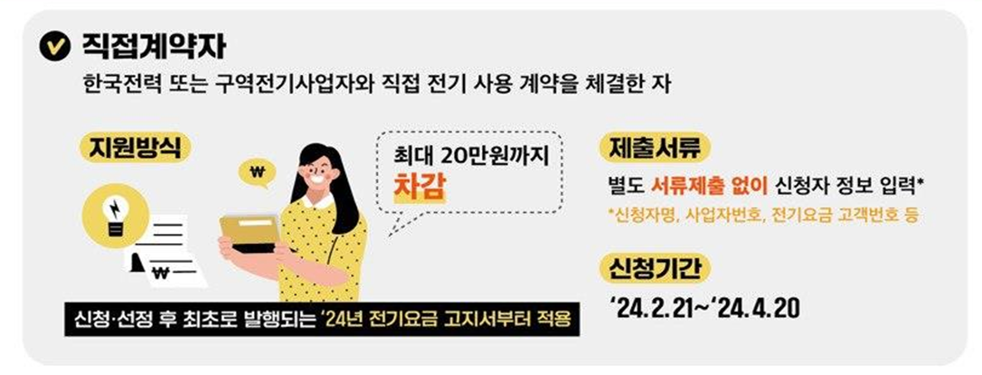 - 한국전력이 직접 계약자의 고지서상 전기요금을 차감하는 방식으로 지원