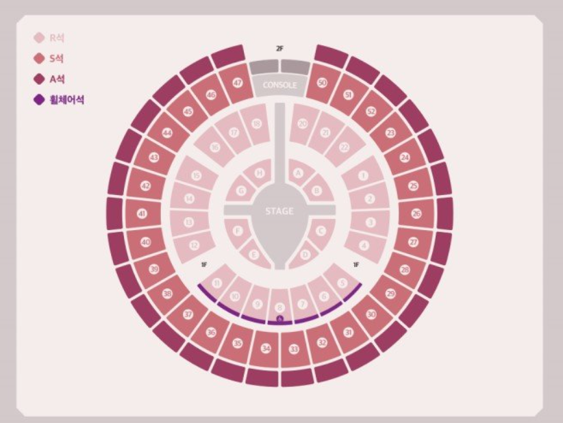 공연 스테이지는 중간에 있으며 좌석은 R석, S석, A석, 휠체어석으로 나누어져 있고 올림픽 체조경기장에서 아이유 콘서트가 진행됩니다.