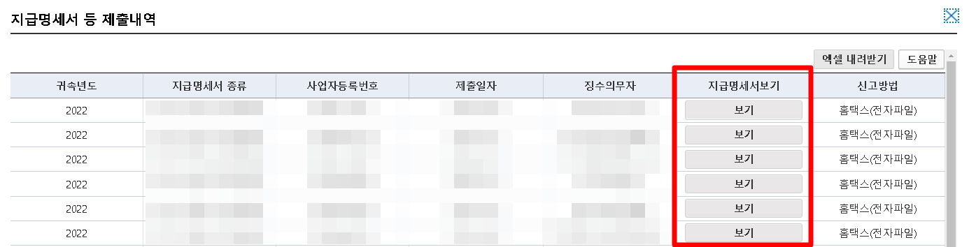 지급명세서 등 제출내역에 관한 사항을 확인 가능하고 지급명세서 보기를 클릭하면 근로소득 원천징수영수증 세부내용 확인이 가능합니다.