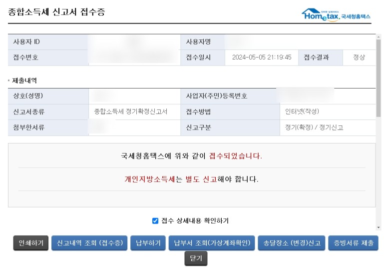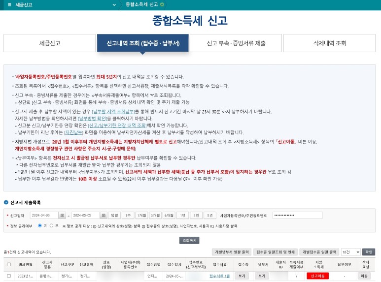 종합소득세 신고 접수증에서 신고내역 조회, 납부하기, 증빙서류 제출이 가능합니다.
