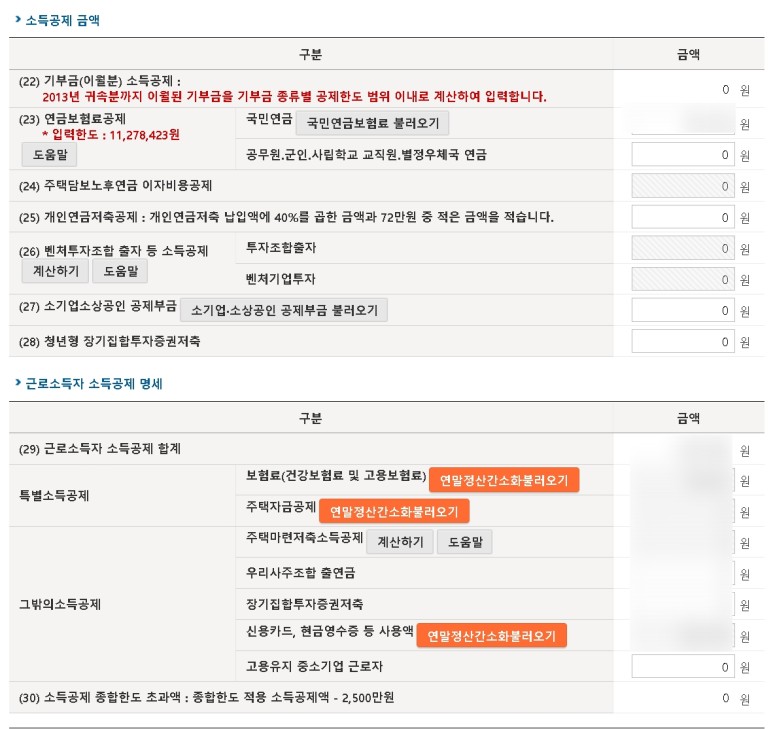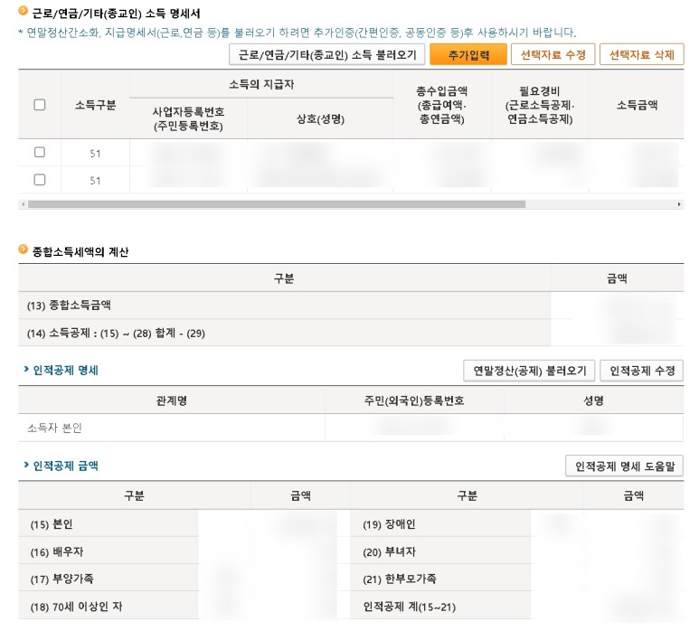 국민연금, 보험료, 주택자금공제, 신용카드 사용 내역서 등 각종 내역을 전부 반영해 줍니다.
