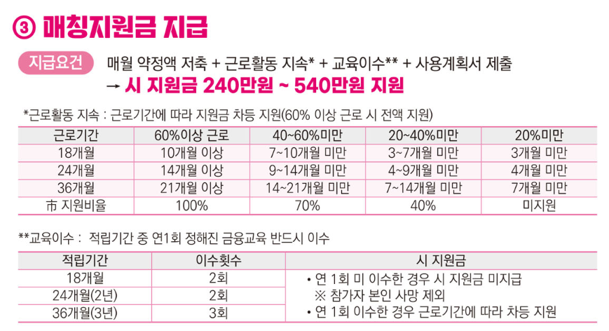 3) 매칭지원금 지급 요건은 매월 약정금액을 저축, 근로활동 지속여부, 교육이수, 사용계획서 제출에 따라서 부산시에서 지원금을 지급합니다.