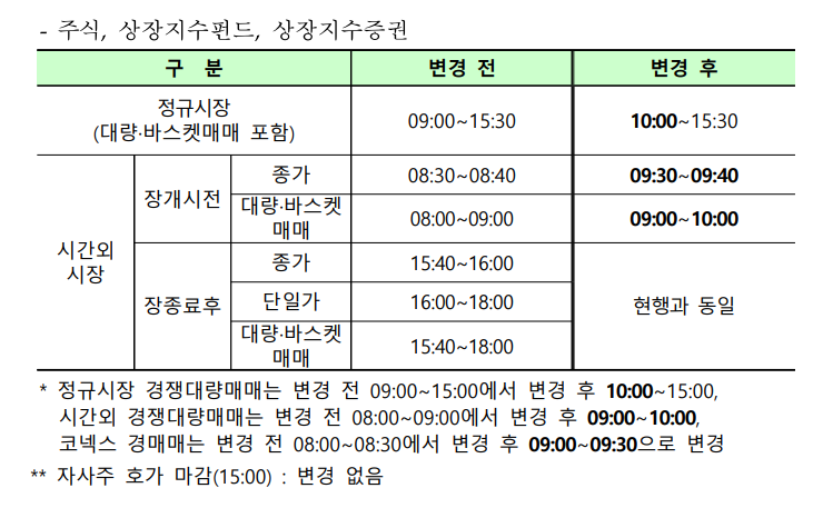시간외 시장은 장개시전 종가는 09시 30분~09시 40분으로 변경, 대량 바스켓 매매는 09시~10시로 변경