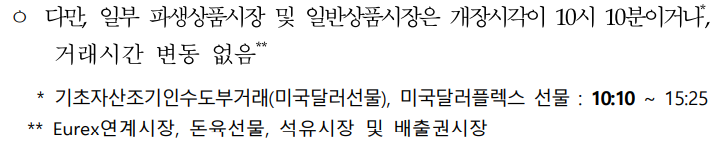 지수, 국채 등 관련 선물, 옵션 협의대량거래, EFP, 미국달러 플렉스 선물은 개장 시작을 1시간 연기하고 종료시각은 동일합니다.