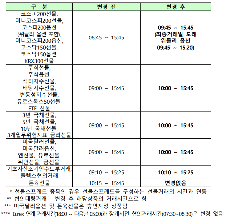 지수, 국채 등 관련 선물, 옵션 협의대량거래, EFP, 미국달러 플렉스 선물은 개장 시작을 1시간 연기하고 종료시각은 동일합니다.