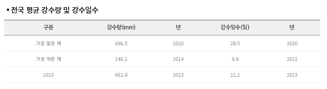 2023년 장마기간에는 많은 강수량을 기록한 한해이기 때문에 2024년 장마기간을 파악하는 것에 있어서 큰 도움이 될 것으로 생각됩니다.