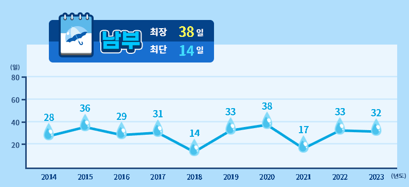 최근 10년간의 기상청 장마기간 통계 데이터 확인을 바탕으로 2024년 장마기간은 2023년에 비해서 다소 강수량이 적을지는 모르겠으나 장마기간은 평균 30일 이상이 될 것으로 파악됩니다.