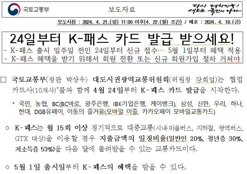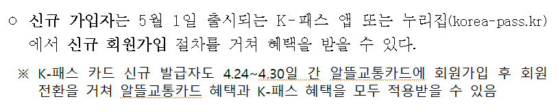 K패스 앱 또는 누리집에서 신규 회원가입을 절차를 거치고 혜택을 부여받을 수 있습니다.
